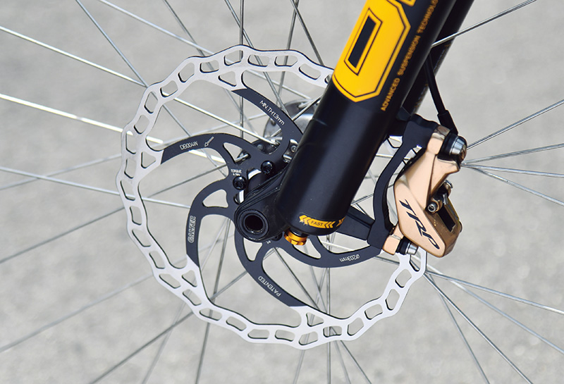 レバーの戻りが素早くコントロールしやすいというTRP のブレーキ。使用するユーザーが少ないためあえての提案としてセットされた。