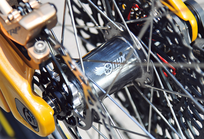 ホイールにインストールされたオニキスのハブは遊びを感じさせない踏み込み時のダイレクト感とノイズレスの静粛性が魅力。