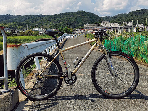 2006年に行きつけのお店の床に転がっていた金色のフレームに一目惚れ。それまでフルサスにしか興味がなかったのですが、軽さや使い勝手の良さから使う頻度は圧倒的にハードテイルに変わりました。