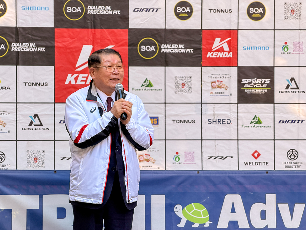 この大会は、トレイルアドベンチャーと地域との繋がりの深さゆえに、地元からの協力が非常に厚い。吉野ヶ里町は、DOWNHILL SERIESの12年の歴史で初めて年間スポンサーとなった自治体でもある。表彰式のバックボードやリザルトシートには「吉野ヶ里町」のロゴが掲げられ、1年間にわたり全国各地でその名を広くアピールしてきた。大会当日は伊東町長も会場を訪れ、バックボードのロゴを感慨深く見つめる姿が印象的だった。
