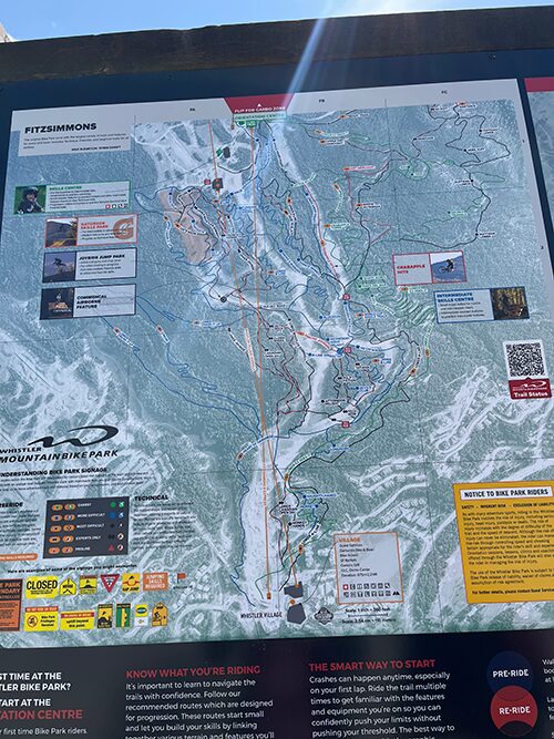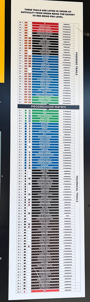 コースは2種類に分けられており、表の真ん中から上に向かってフリーライドトレイル、下に向かってテクニカルトレイルが難しくなるように記されています。