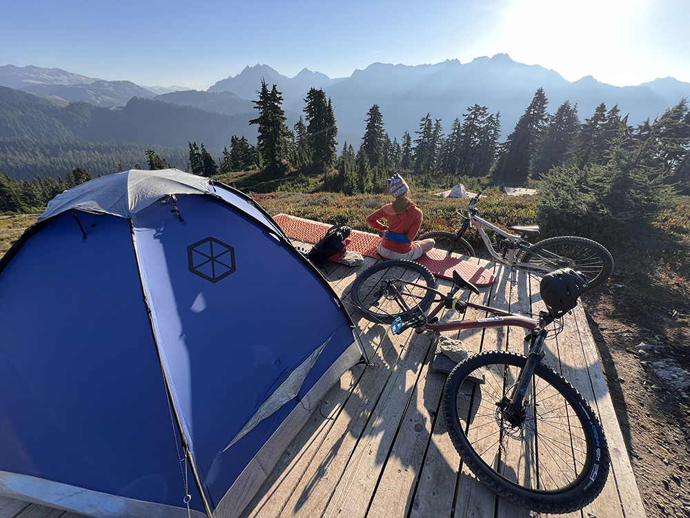 この、テント×MTB×アルパインの景色という見慣れない光景に胸が高鳴ります。