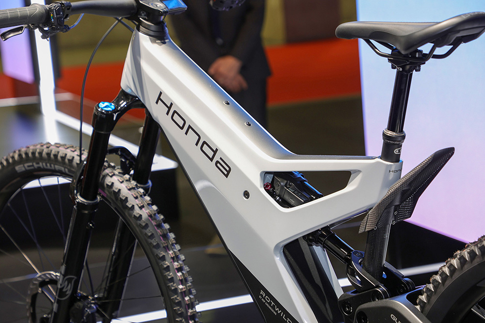 展示車両は、アシストモーターにはシマノEP-8。変速機構にXTR Di2。前後サスペンションにFOXを装着。リアトラベル150mmとのことで、ホンダのDHレースバイク、RN01のイメージを踏襲しつつも「Ride Natural・Reach New Peaks」というコンセプトに基づいたオールマウンテンモデルとなる模様。