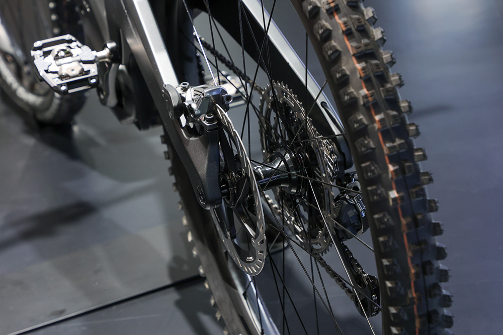 カセット、ブレーキもXTR M9200シリーズ。車重に対応した4ピストンキャリパータイプを採用。