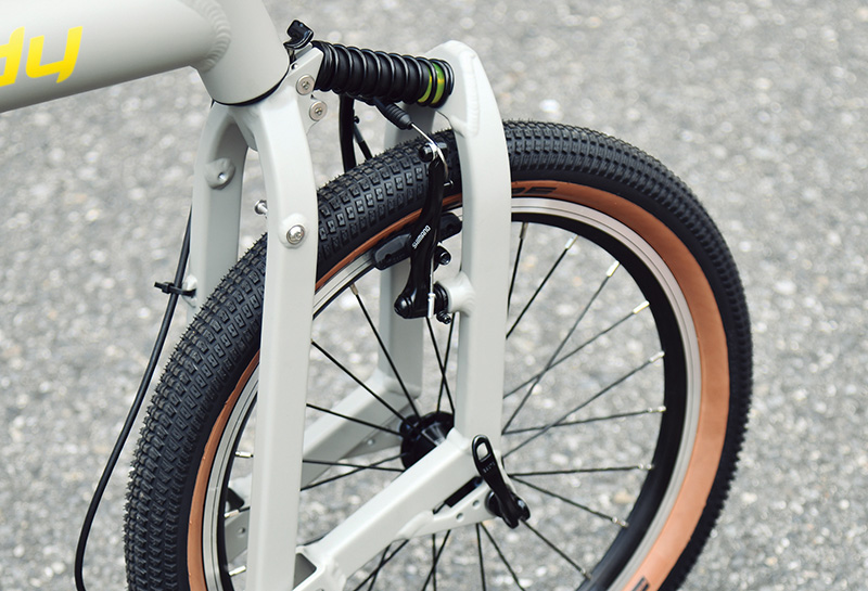 小さなブロックが配置されたサイドスキン調のタイヤへ変更。レバーを含め、ブレーキをシマノのアイテムに換装することでコントロール性を向上させた。小径リムのカーブに合わせた65ミリのブレーキシューを採用する。