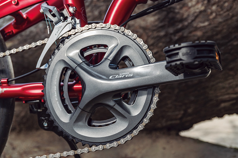 ドライブトレインはベースバイクのものを生かしつつフロントダブル化。チェーンリングは50-34Tを採用。上りから下り、平地の巡航まで幅広い地形をカバーする。