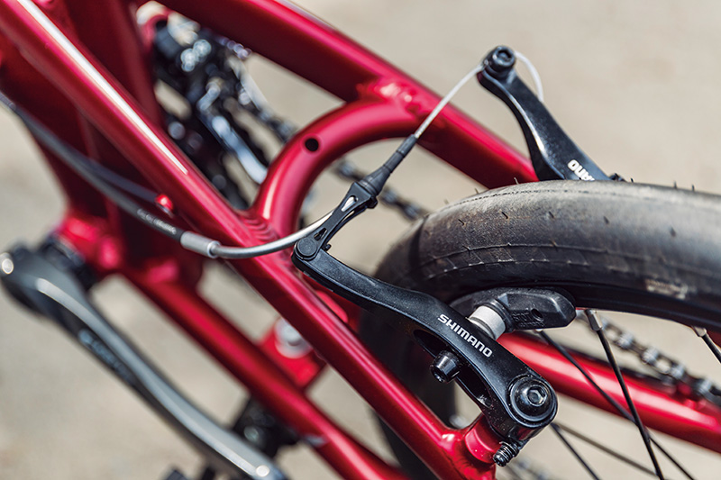 STIレバーのブレーキワイヤーの引き量に合わせ、Vブレーキのキャリパーをショートタイプに変更している。