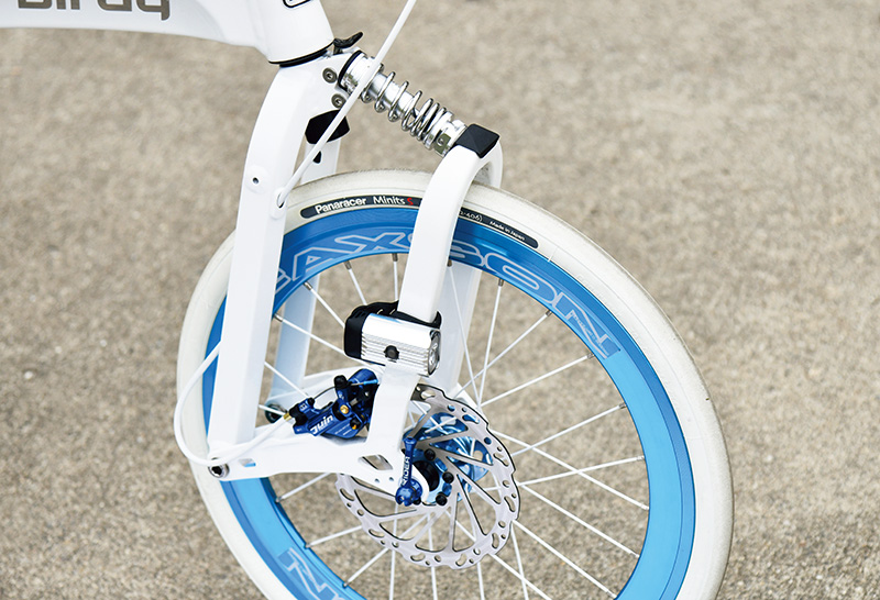 足回りはアルマイトカラーのディープリムホイールへ換装。ブレーキはキャリパー仕様からセミ油圧ディスク仕様へとアップグレード。マルチSのサスペンションを前後に投入することで走行性能の向上も狙った。これほどの内容で、車体重量はバーディーエアのスペックを維持しているという。