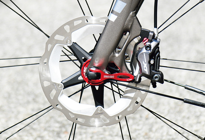 ブレーキはXTグレードの油圧ディスクタイプへとアップグレード。4ポットキャリパー(フロント)&180mmローターが生み出す制動力は、下り系MTBさながらのハイスペック。