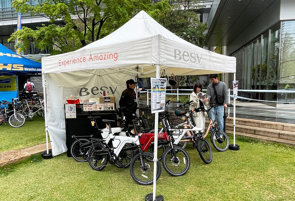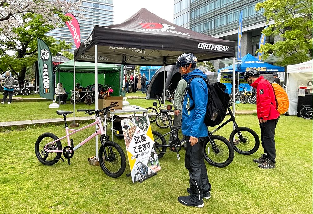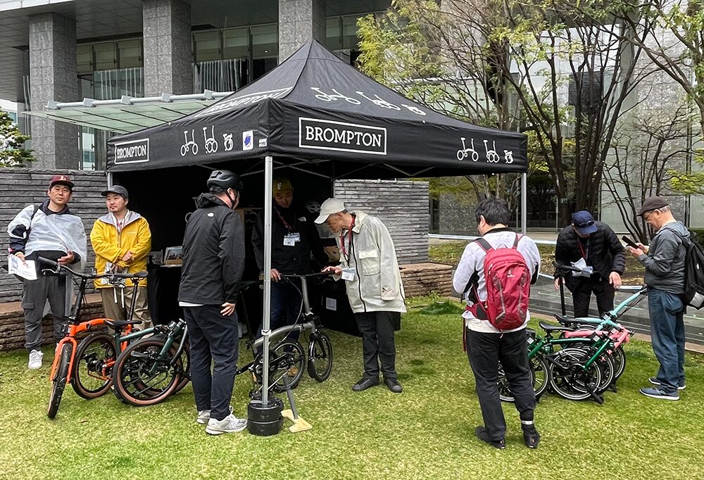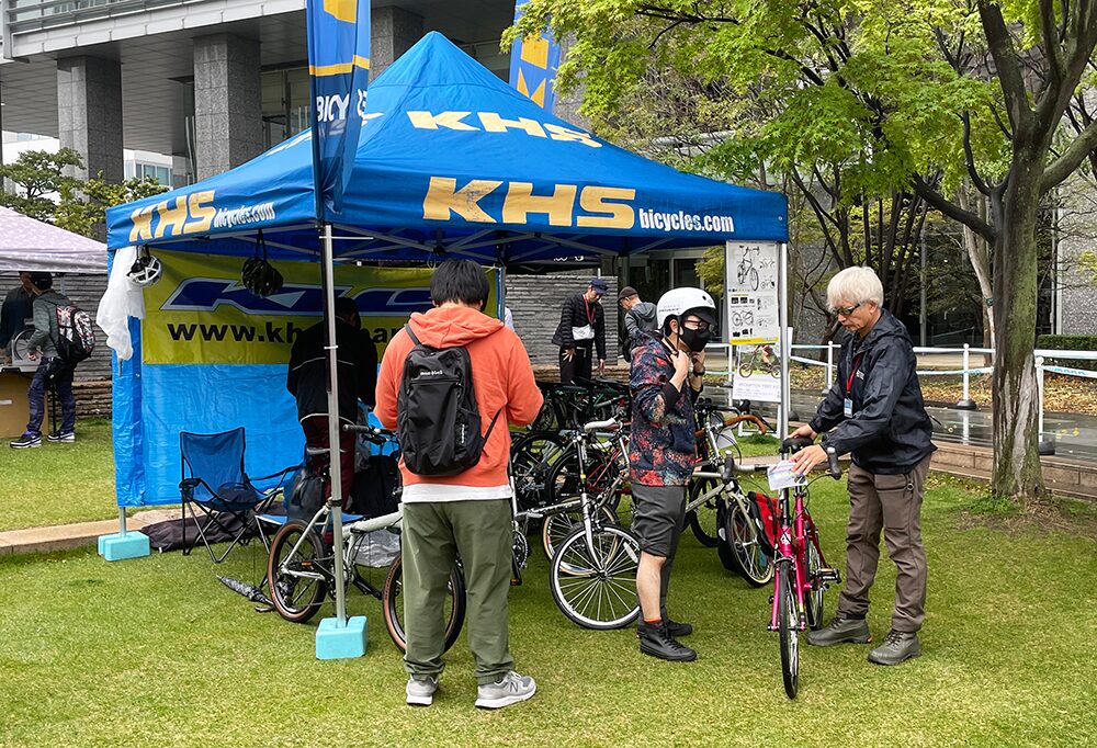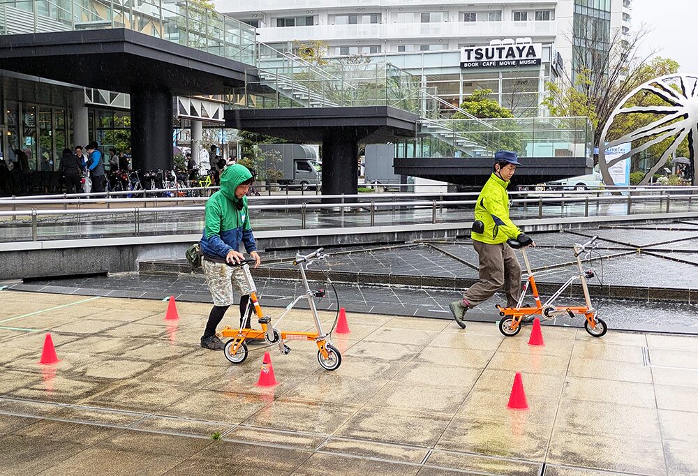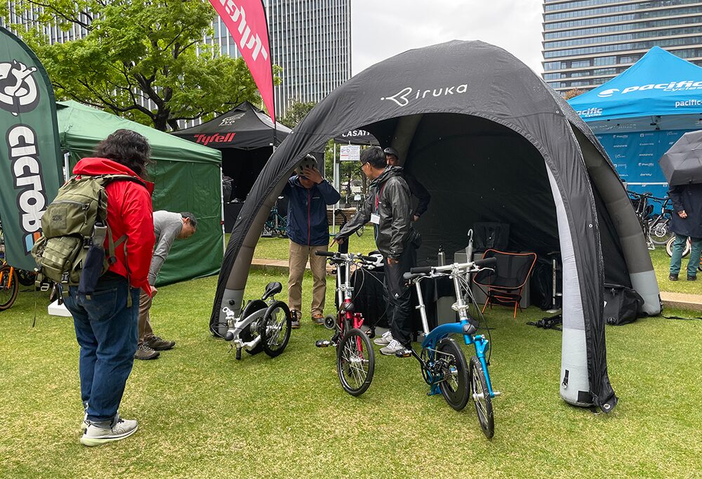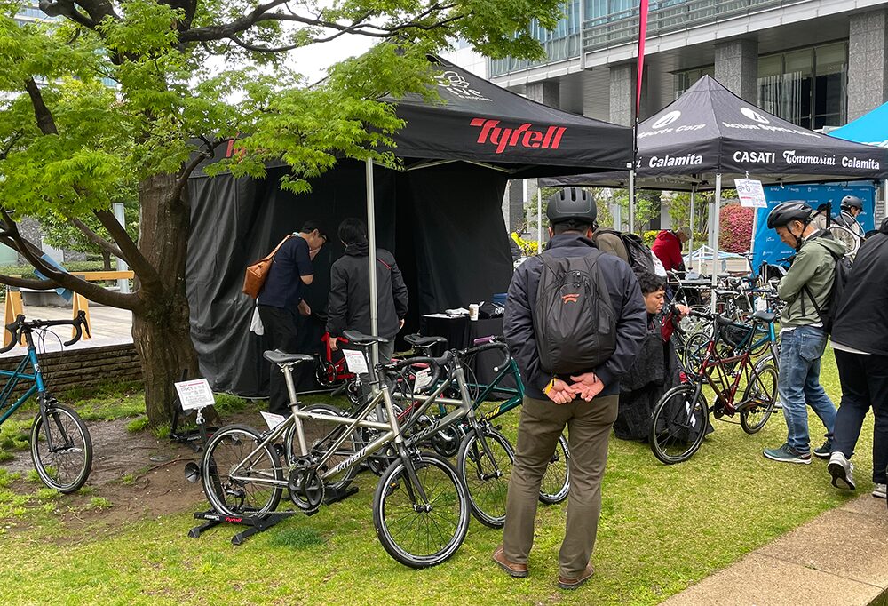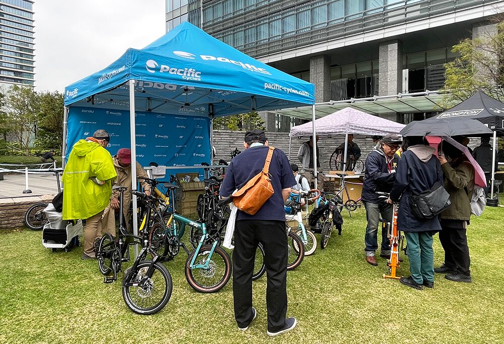 屋外のミニベロ展示&試乗エリアには、人気・注目ブランドの試乗車がずらり。多種多様なミニベロに触れることができる貴重な機会とあって、参加者は天気の様子を見ながら思い思いに試乗。なかには雨をものともせずじっくり乗り比べをする参加者の姿も。